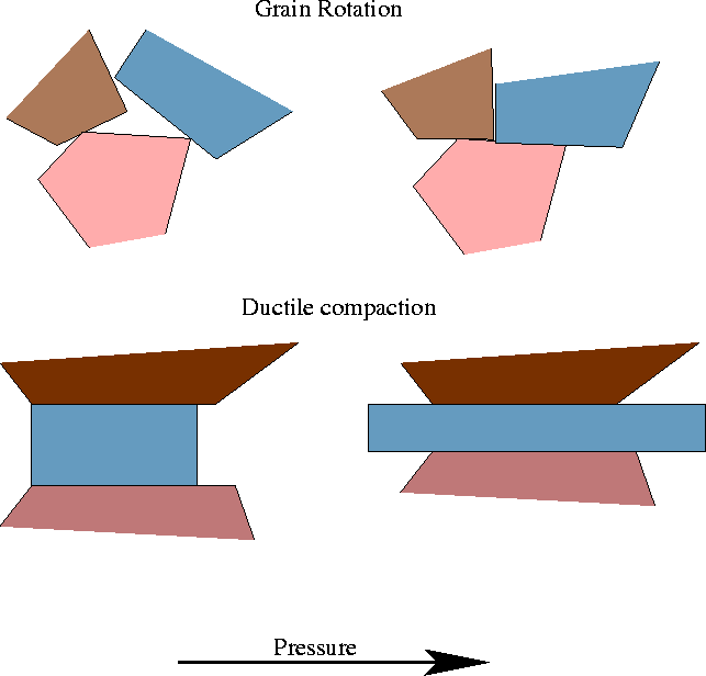 Figure 8 Three compaction, without crushing mechanisms: 1) grain rotation, 2) ductile compression of grains, or 3) compression of pressured pore space (the transition of an over-pressured state to a grain supported frame). | ![]() |