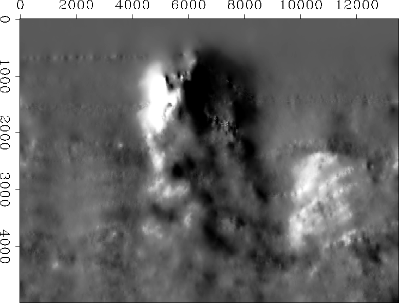 Dip fields, described in Fomel (2000) can be helpful in interpreting seismic data. Fig. 5 shows the value of the strongest dip in the corresponding point of Fig. 4, computed with the programs accompanying Fomel (2000). It is not easy to visually correlate the features in the two images. But when the dip field is used for chrominance, and the seismic image for luminance (with the operator M containing a 97 percent clip before applying jet colormap), the unconformities, as well as the areas with conflicting dips, become highly visible. (Fig. 8)