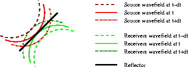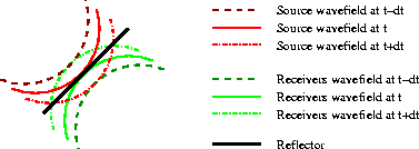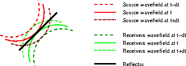 Figure 7 Wavefronts as in Figure 6. The two highlighted wavefronts (time t) intersect in the middle of the reflector, and they contribute to the image at the intersecting point. | ![]() |