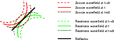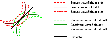 Figure 6 Wavefronts for the source wavefield (red), and the receiver wavefield (green), for three time steps (t-dt, t, t+dt). The wavefronts at t-dt are highlighted in darker color. The two highlighted wavefronts do not intersect, and thus their contribution to the image is null. | ![]() |