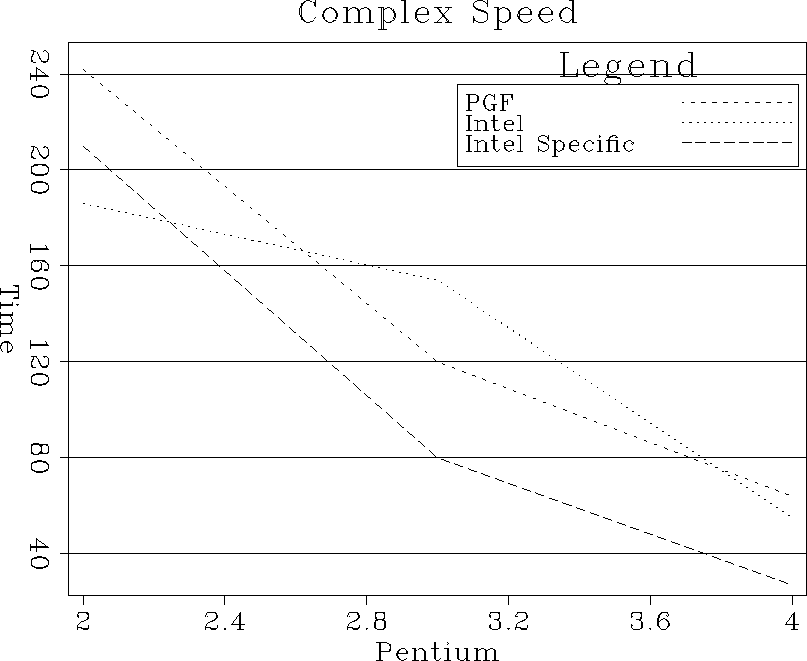Figure 3 Speed comparison for complex matrix multiplication. The horizontal axis is machine (P2-550, P3-800, P4-1700). The different curves represent the PGF compiler, Intel compiler, and Intel with machine specific instructions. Note the significant advantage of the Intel machine specific code. | ![]() |