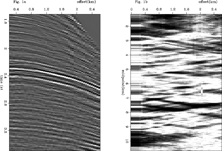 Figure 1 a: Part of a CMP gather exhibiting FEAVO anomalies. The strong event at 2.3s shows a slight departure from hyperbolic moveout, too subtle to allow successful classical traveltime tomography. b: FEAVO anomalies in the midpoint-offset space (Kjartansson ``V''s). The preprocessing consisted in: muting, spherical divergence correction, bandpass filter, interpolation of missing or noisy traces, hydrophone balancing, f-k filtering, and offset continuation to fill in the small offsets (with a forward and inverse DMO cascade using the log-stretch DMO in the Fourier domain described in Zhou et al. (1996) and implemented by Vlad and Biondi (2001)). The figure has been produced exactely as in Kjartansson (1979): square and vertically stack the data between 1.5 and 3.5 seconds, then take the logarithm to increase the dynamic range. Offset continuation does not predict the FEAVO anomalies (the tips of the ``V''s are not extended into the extrapolated small offsets) | ![]() |