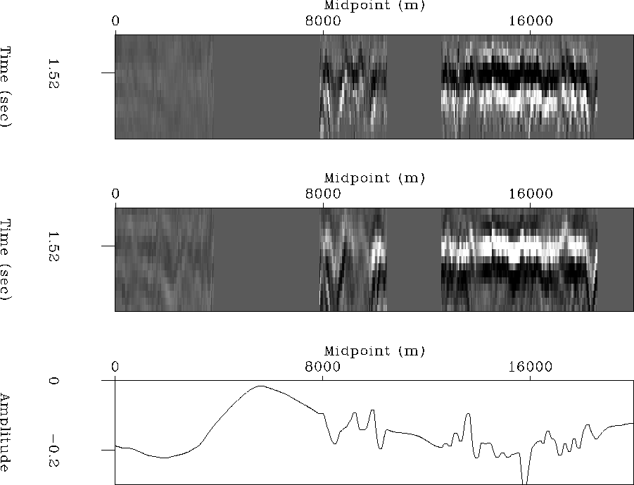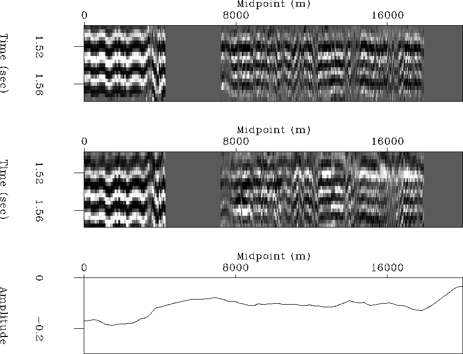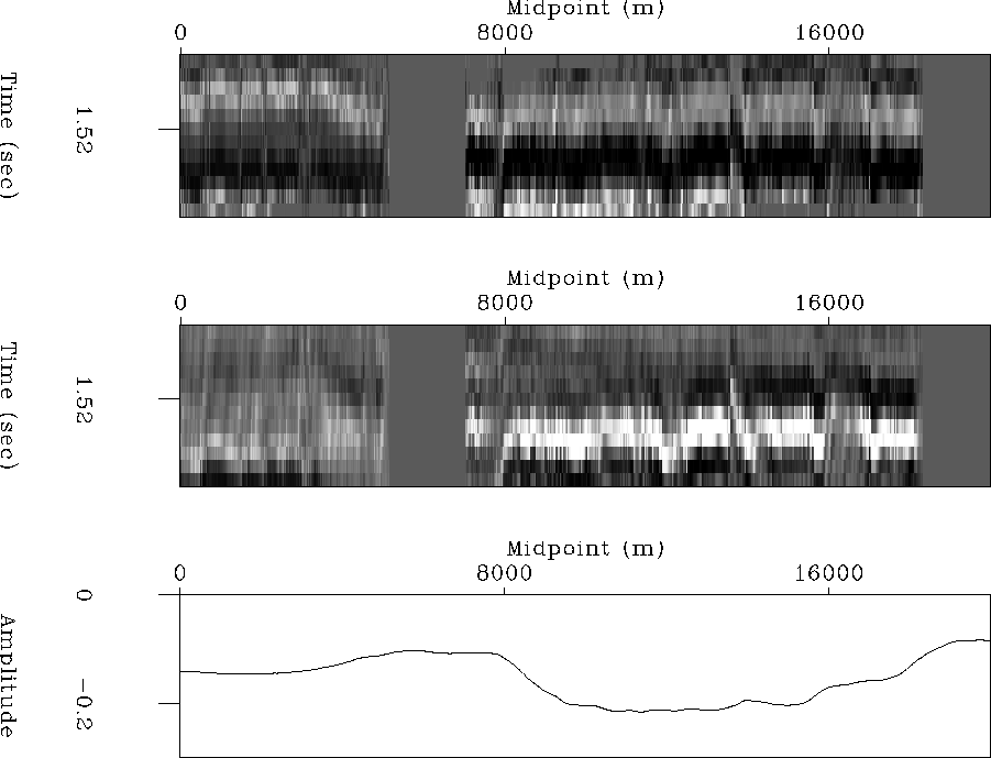 Figure 5 Top: Stack of window around top-of-salt reflection (TS). Center: Stack of window around top-of-salt pure multiple (TSM). Bottom: estimated TS reflection coefficient. | ![]() |