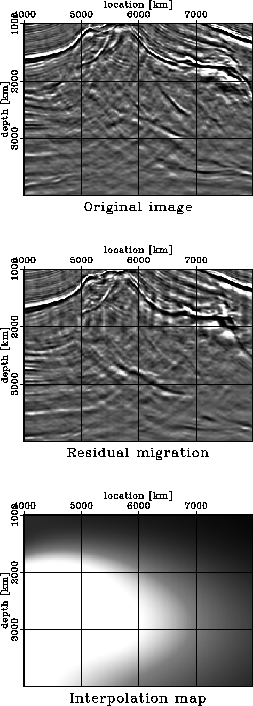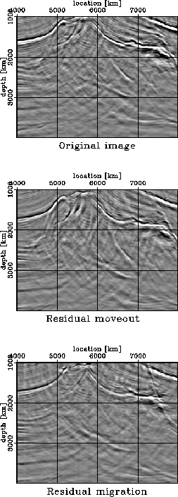Figure 8 A comparison of the original image (top panel) with the image obtained by residual migration (middle panel) with a spatially varying | ![]() |