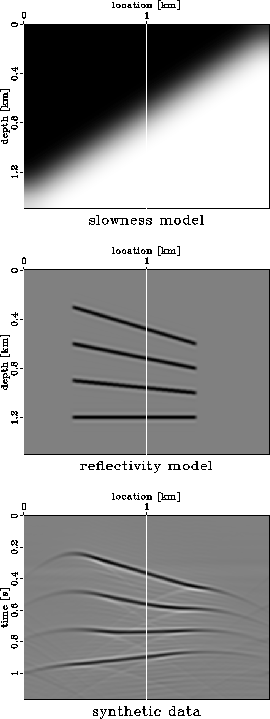 The first example is a simple 2D model with a 4 dipping reflectors embedded in a velocity model which varies smoothly both as a function of horizontal position and as a function of depth. synt.model shows, from top to bottom, the slowness model, the reflectivity model and the zero offset of the 2D modeled data. The data were generated with a wavefield-continuation operator (24; 82; 86). The maximum offset of the simulated data is 2.56 km, and the velocity ranges between 2.0 km/s in the upper left corner to 2.4 km/s in the lower right corner.