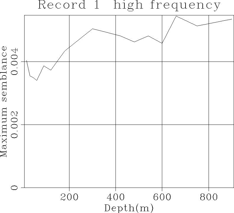 Figure 11 Maximum value of semblance as a function of depth for Figure 10. Note the increase at around 700 meters, suggesting that non-surface sources are present. | ![]() |