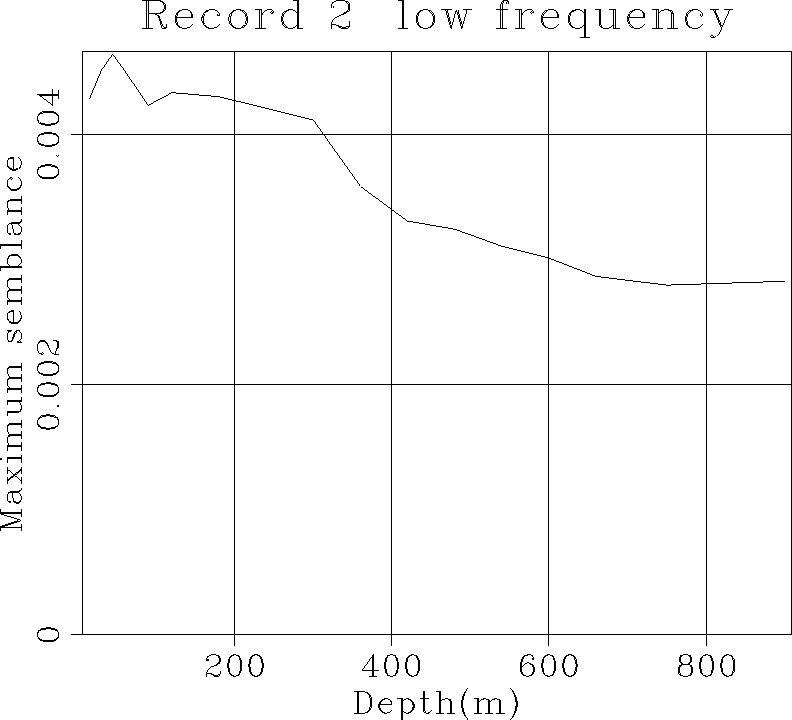 Figure 9 Maximum value of semblance vs. depth for Figure 8. Surface sources are not as dominant as in record 1. | ![]() |