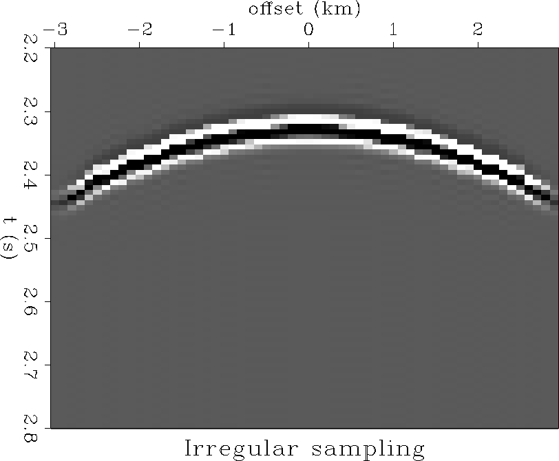 The algorithm is demonstrated on a synthetic shot gather along a planar datum. A Kirchhoff code was used to generate the gather on a coarse grid, which was then subsampled unevenly, so that the sampling interval varies between about 50 m and 150 m (Figure xintsyn). The effect of the irregular sampling is similar to the effect of statics since each trace has a slight departure from hyperbolic traveltime due to the variation in offset (Figure irrsyn).