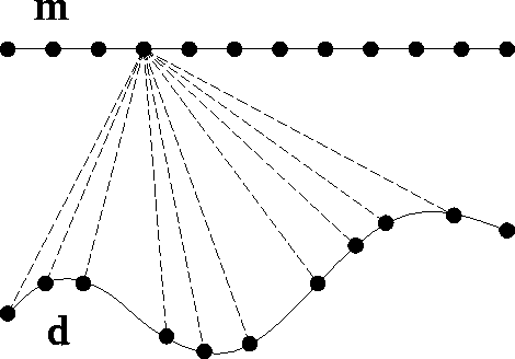 Figure 1 Upward continuation from an irregularly sampled rugged topography to an evenly sampled flat datum. Input traces d are time shifted, weighted, and summed into output locations m. | ![]() |