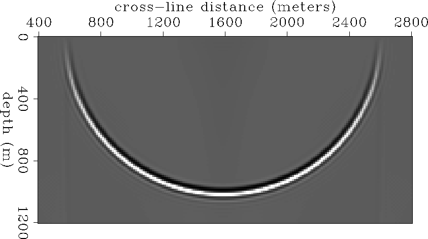 Figure 2 Vertical section from the impulse response of the 3-D reverse-time extrapolation scheme. The operator has a high-dip accuracy. | ![]() |