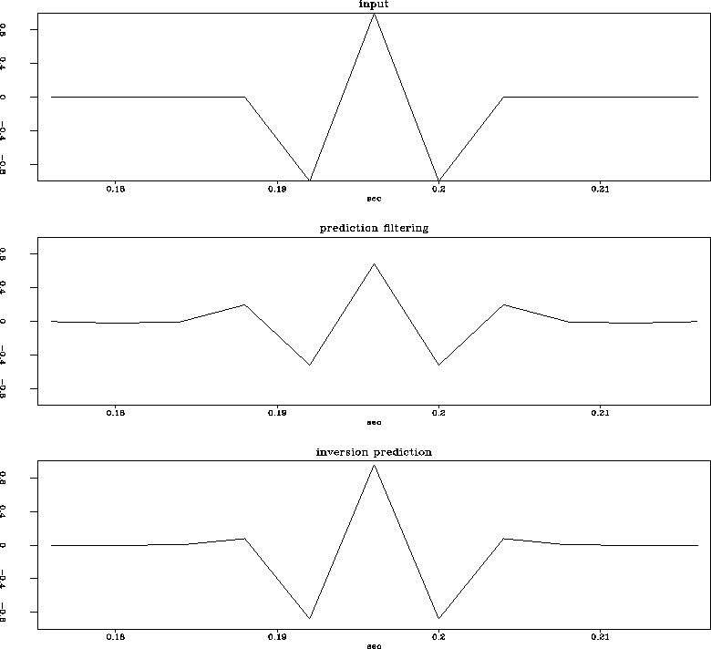 An example of the difference between prediction filtering and inversion prediction is seen in Figure onespikea. The filter S is calculated from the data to predict the flat event. When S is applied to the spike, the filter response can be seen in the prediction filter result. The inversion prediction result has effectively eliminated the filter response.
