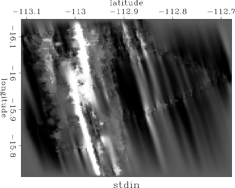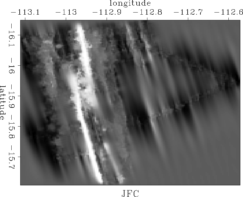 Claerbout has used this method with a single grid (a model 160 points on a side) and achieved a good result, which can be seen in Figure levint . This result displays the qualities we would like to see in the output model. That is, the ridge segments in the sparsely sampled right portion of the survey area have been connected without smearing them terribly, and in the more densely sampled part of the survey area, it is hard to tell where data is known and where it is interpolated. Convergence, however, is slow. This result takes about 300 cpu minutes to generate running on our HP 700. Also, we may wish for a model with more structure and less smoothing away from the known data.