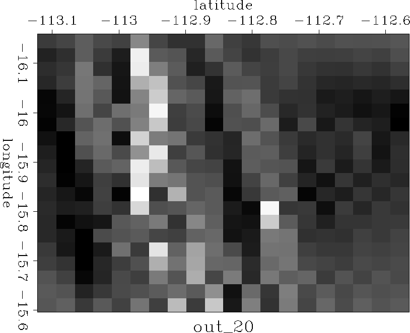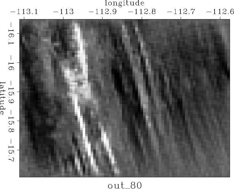 The model M can be chosen to have any number of points within the practical limitations of the data. The multigrid approach taken here is to begin by inverting for a very coarse model, with just 20 points on a side, and use the output as the initial guess for a more detailed model (the 20 by 20 model is pixel zoomed to become a 40 by 40 model, each bin being divided into four), and in this way gradually obtaining more detailed models. This serves several purposes. First, information is propagated into large unknown areas more quickly; the large unknown areas visible in Figure ras18 correspond to only a few tens of model points in the early stages of the problem. Second, because the filter isn't scaled up or down with the model, it operates on a range of spatial frequencies - the physical space occupied by the filter decreases as the number of points in model space increases. Thus large scale features and trends are resolved early in the inversion, and smaller scale features are overlaid. The workings of this are well illustrated by results displayed in Figures out2020 through out160160.