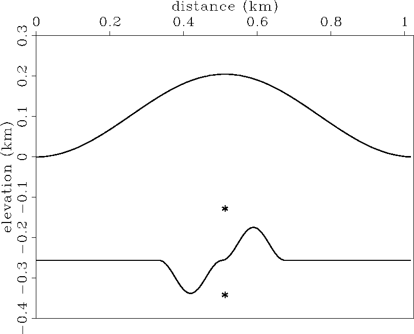 Figure 6 Synthetic subsurface model and topography. Topography and subsurface structure used to generate the zero-offset synthetic data. The two point diffractors are depicted by astrecies above and below the anticline/syncline structure. | ![]() |