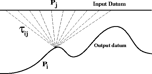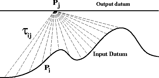 Figure 3 Schematic representation of Kirchhoff downward continuation corresponding to the operator of equation ( ). Each input trace Pj