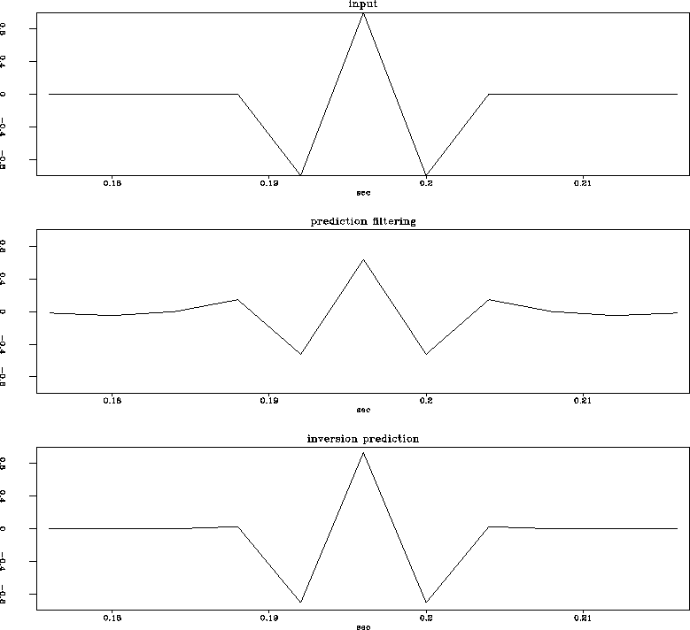 Figure 4 A single trace taken from the right side of the data. The original reflection on the top shows a three-point wavelet. The middle plot is the t-x prediction result. The bottom plot is the inversion prediction result. | ![]() |