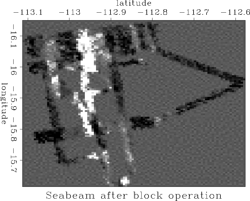 Figure 3 shows the result of the block operation. The block operator interpolates the Seabeam data and adds to it some background filter noise. The filter used is a Laplacian filter.
