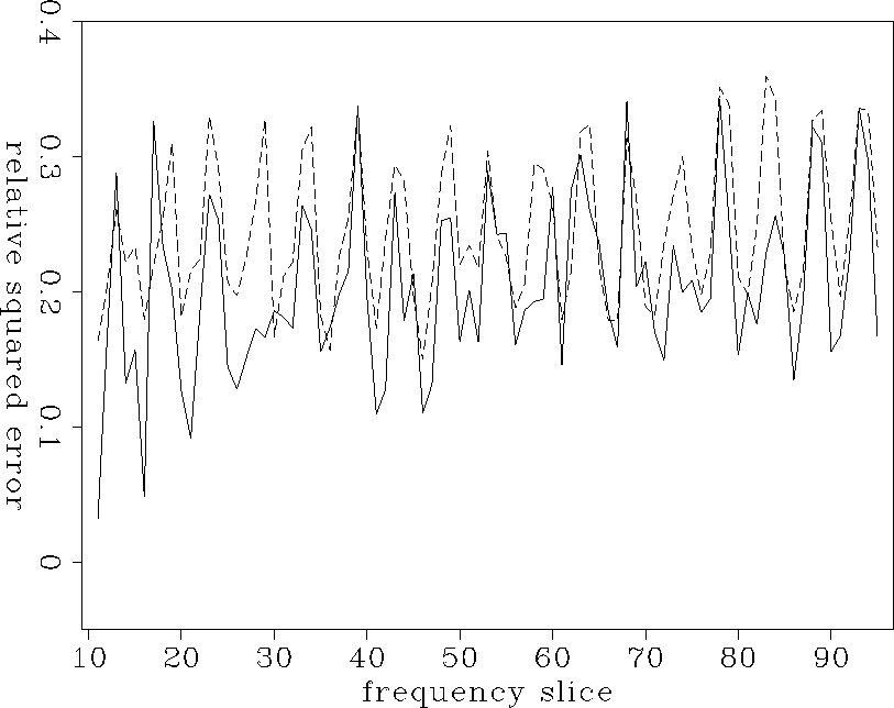 Figure 11 Squared error for both F-X noise suppression and Pyramid scheme. Notice that the subsampled dataset is even more predictable than the oversampled dataset. | ![]() |
