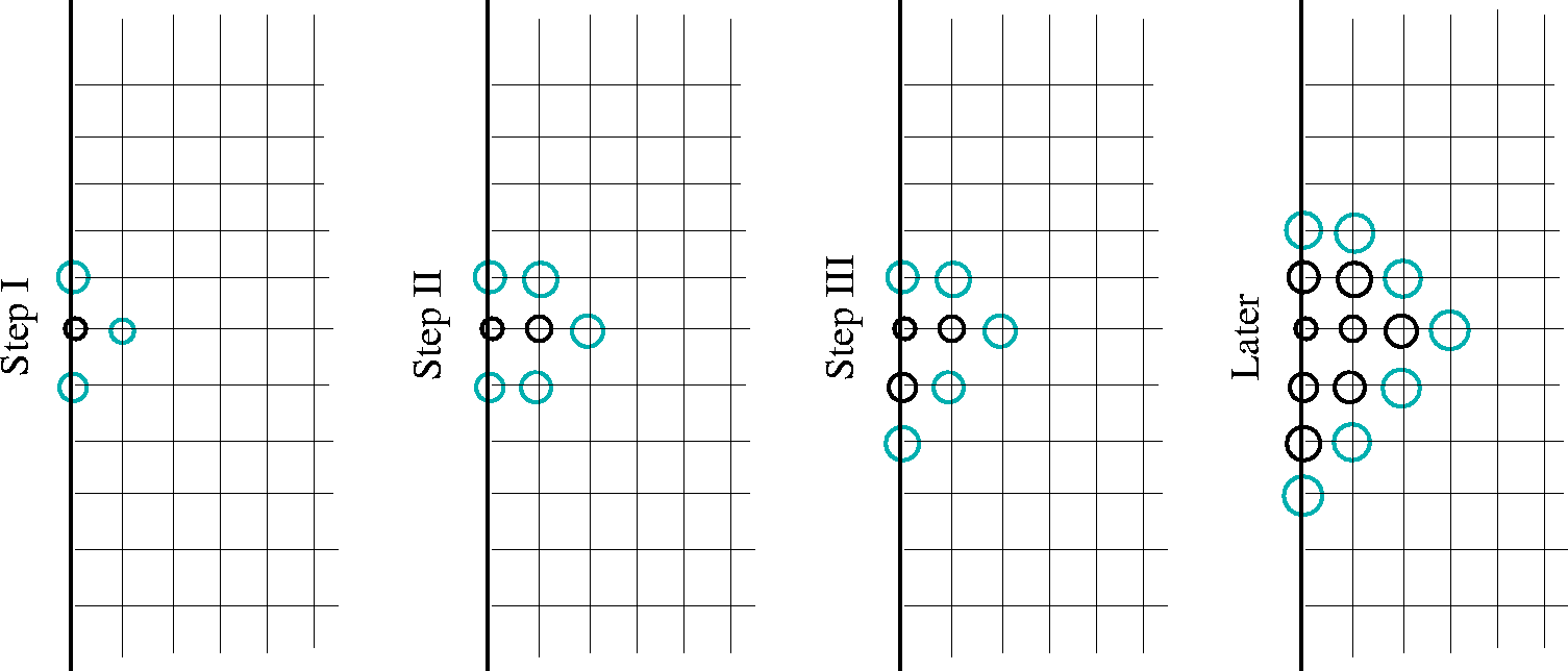Figure 2 The steps taken to implement fast marching in Cartesian coordinates. Black circles imply computed traveltimes that are set, because of their minimum nature, at the time of extraction from the heap array. Gray circles constitute the front of the wave, and they are stored in the wavefront heap array and sorted from minimum to maximum traveltime value. The traveltime is schematically given by the size of the circle; the larger the radius, the greater the traveltime. The minimum is always extracted first from the heap array at each step, its traveltime is set (given a black circle), and surrounding grid points that are not set are computed and inserted into the wavefront heap array. We precede until all grid points are computed and set. | ![]() |