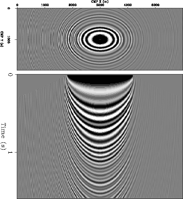 Figure 13 Image obtained by applying Kirchhoff migration with ``directed'' anti-aliasing assuming | ![]() |