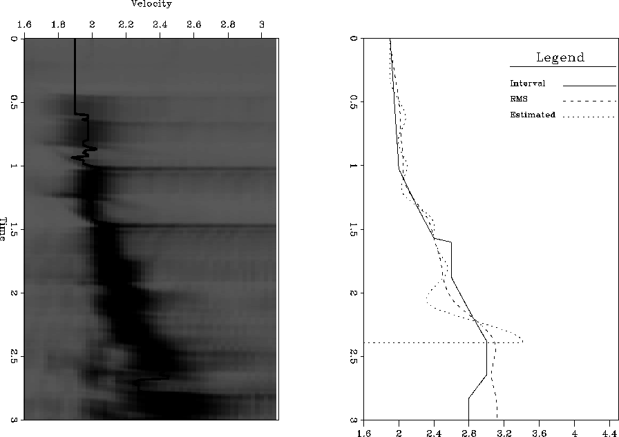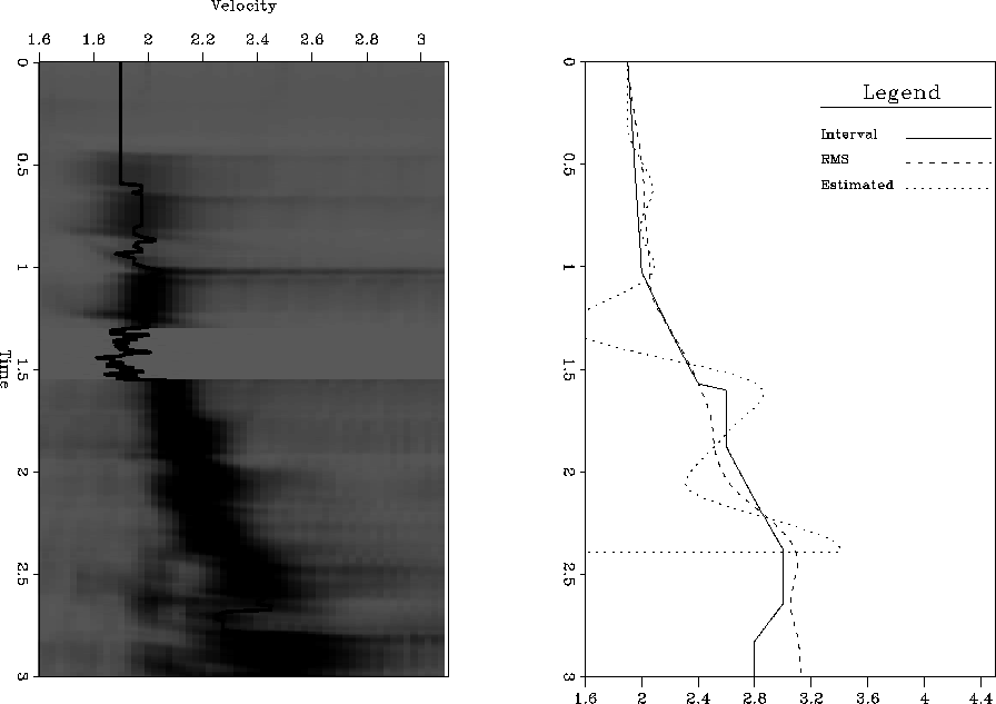 Figure 8 Left panel, RMS picks overlaying semblance scan with noise introduced at approximately 1.5 seconds. Right panel, the resulting interval velocity curve, the curve without the bad data, and our bad-data RMS curve. | ![]() |