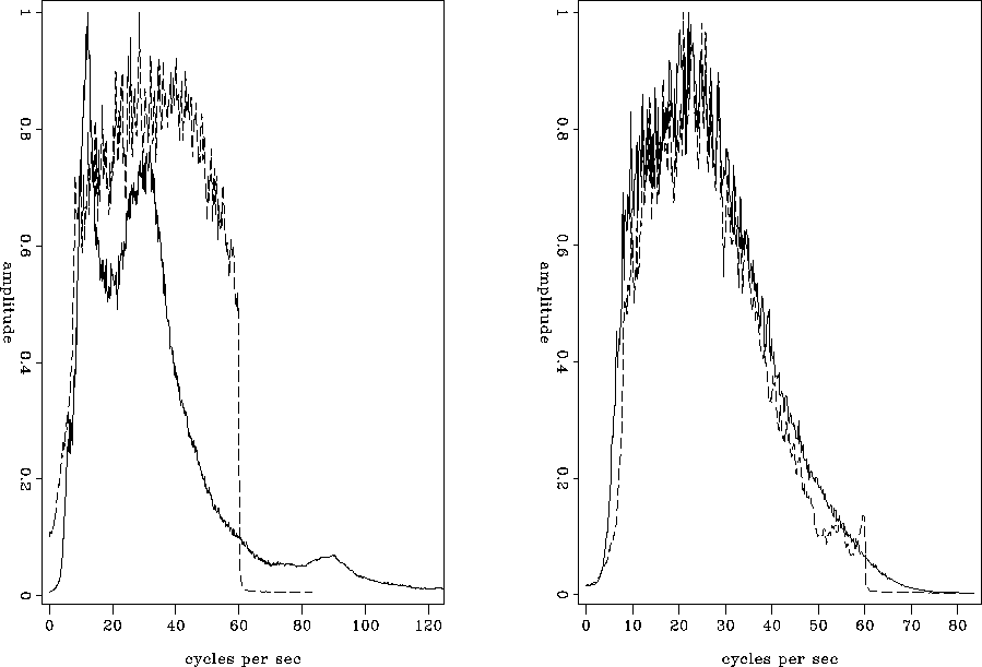 Figure 3 Amplitude spectra before (left) and after (right) matched-filtering. The solid line corresponds to the 1979 survey and the dashed line to the 1991 survey. | ![]() |
