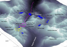 On Forest Service maps, you will see an "Secondary Trail-Unmaintained" passing up Glines Canyon to Virginia Pass. On USGS maps, you see nothing. Secor describes this trail as a "good use trail". Truth be told, it is pretty good in most spots, but a few places merit a detailed description. The use trail begins at the sign for East Lake and West Lake. Veer to the left and descend along the trail to the lake level. Follow the trail through the marshy, horribly buggy northwest corner of the lake. The trail follows the west shore of the lake and becomes sketchy. You will have trouble finding it in the forest, but remember: the trail follows the west shore and turns west to follow Green Creek up Glines Canyon. Above the lake, the trail improves in quality and climbs fairly steadily to Virginia Pass; 1500 feet in 2.5 miles. Directly before Virginia Pass, at 10,200 feet is a marshy meadow. You may lose the trail here, but you need only shoot toward your goal, Virginia Pass, a notch at the south end of the saddle. In summer, the pass is an easy scramble. Covered in snow, it would prove more challenging, but the slope angle rarely, if ever, exceeds 30 degrees. The views from Virginia Pass were superb, most notably of Virginia Peak, Shepard Crest, and into the distance toward Tuolumne Meadows. I was suprised to clearly make out Cathedral Peak and Tressider Peak, and especially Half Dome.