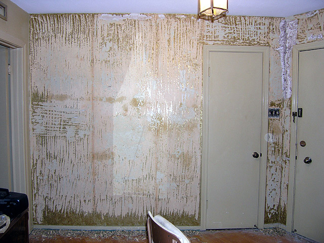 I had to include this for comic value--stripping foil wallpaper is hellish! Also notice the "shadow" of the mirror that was previously hung on the wall. The chemicals in smoker's tar may penetrate wallpaper, hence the difference.