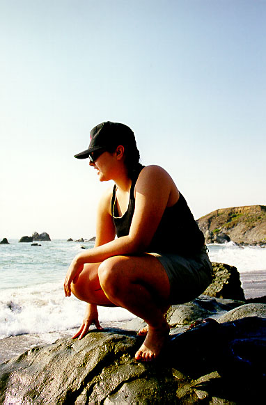 Kim on rock at Shell Beach on the Mendocino Coast.