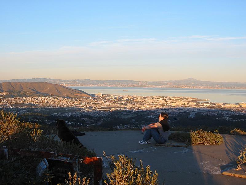 Kim and Lion enjoy an unusually clear December day from the abandoned Nike Missile base at Sweeney Ridge.