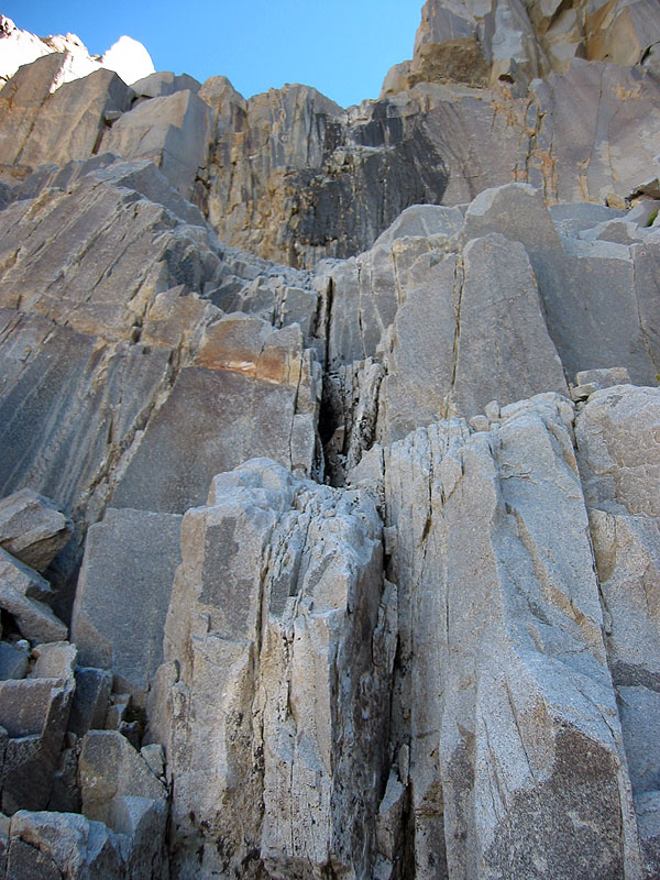 Secor's description of the Southwest Face route notes a "Black Waterfall" which signals climbers to traverse to the gully which leads to the summit. This is the waterfall. It probably only contains actual water until May or June.