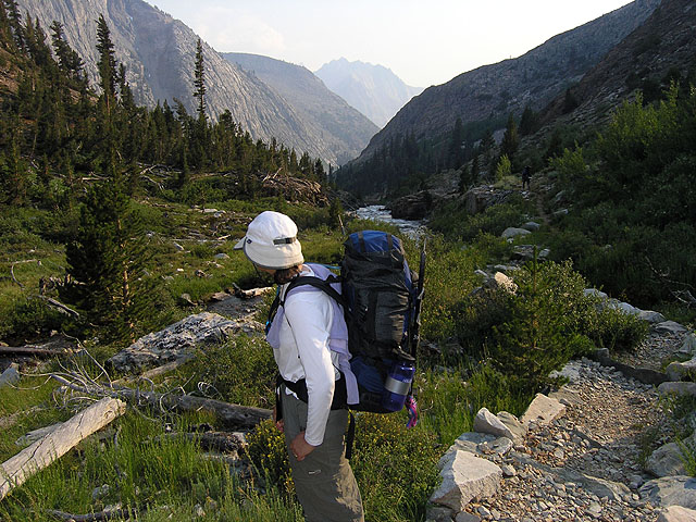 Kimberly along JMT, descending toward campsite on Woods Creek, at JMT/Paradise Valley Trail split.