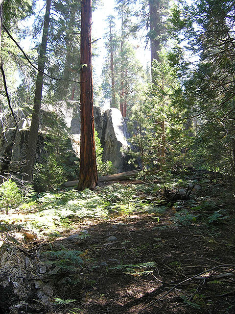 A nice display of Cedar trees, ferns, and boulders near confluence of Woods Creek and South Fork Kings River.
