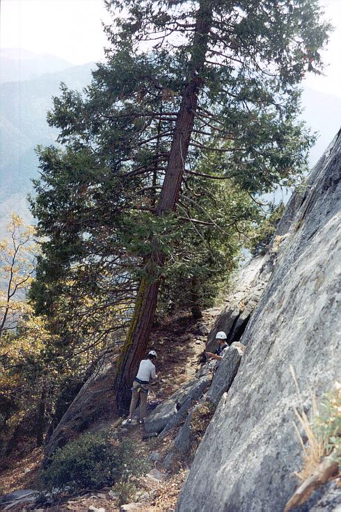 Our rappels ended in front of this tree. Many other 1-2 pitch climbs begin at the base of the cliffs here.