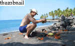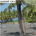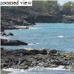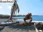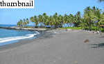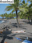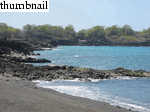 On 24 March, 2003 we visited (on Jon Claerbout's recommendation) Honomalino Beach, roughly 30 miles south of Kona, near the town of Milol'i. After hiking through choked scrubland for twenty minutes and passing about as many "Kapu: No Tresspassing" signs, you reach a truly fantastic (mostly) black sand beach. The seclusion of the place makes it a welcome destination for those (like myself) who tire easily of tourist crowds. While the snorkeling isn't the best on the island (it's still good), the bay offers about a mile of fine swimming.