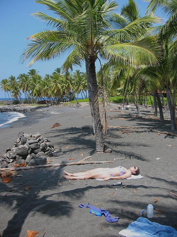 Kim enjoying the black sand and sun on Honomalino Beach.