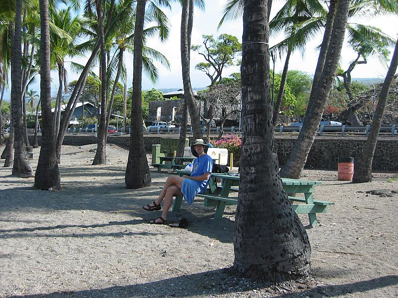 Morgan relaxes on a picnic bench after snorkeling in Kahalu'u Beach Park.
