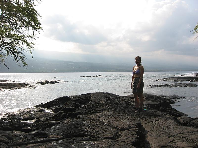 Kim posing on dry land, after a mile-long kayak trip across the calm waters of Kealakekua Bay.