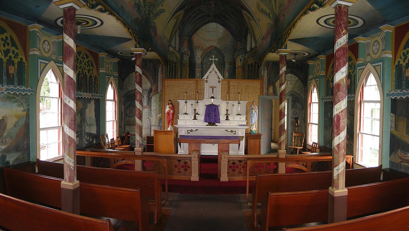 | If you're driving between Kealakekua Bay and Place of Refuge, take a short stop at the Painted Church. Interesting place. The paintings were made by a white missionary pastor, and they meld the old-style Christian message with the Hawaiian culture of the day. |