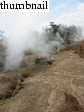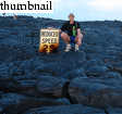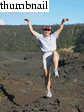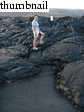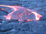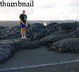 Soon, however, we were on to the day's main attraction, a viewing of Pu'u 'O'o's active lava flows. Although we'd been warned about crowds, the traffic was light. When we neared road's end, we simply realized that we were late! Cars were parallel parked for easily a mile from road's end. The road was closed another mile from the actual point where lava crosses the road. From there, roughly another mile of walking is required to reach the active lava flows. Despite the crowds and the walking, our enthusiasm to see the lava was not dimished. Before we knew it, the temperature became hot. I looked into a fissure between my legs, only to see it glowing from within with red hot molten rock! Soon we came to a point where the lava was actually actively flowing. At some places it moved relatively fast (1-2 inches per second). It rolled over living trees, lighting them aflame in the process. In the distance, steam clouds belched skyward as lava poured into the ocean.
