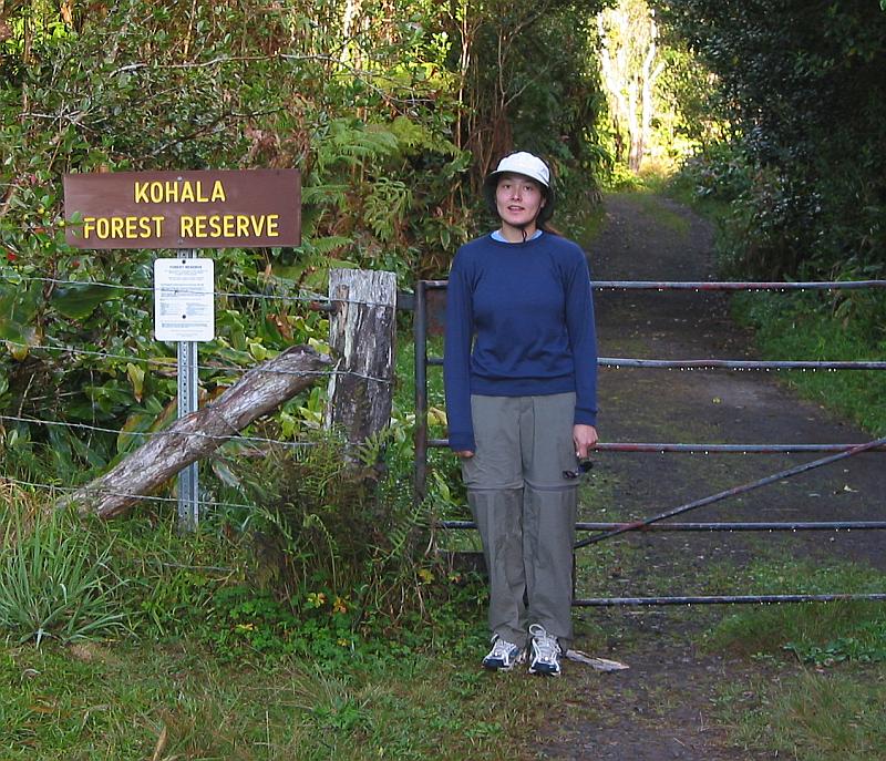 Kim at the trailhead for the hike around the head of Waipi'o Valley. The trail starts at the north dead-end of White Avenue east of Waimea.