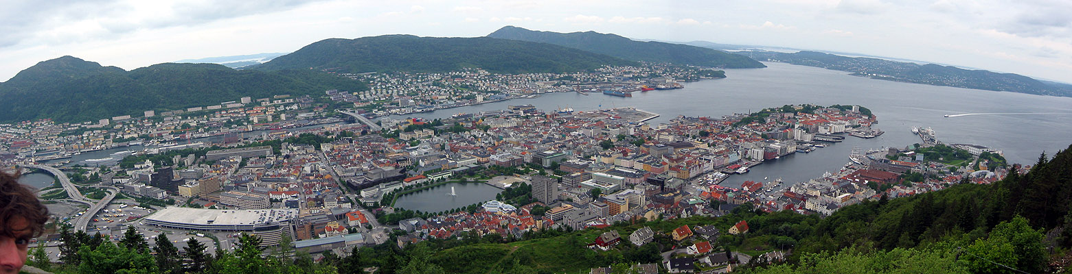 Panoramic view of Bergen from Mount Floyen, which stands 300 meters above the city. A cog railway hauls tourists (ourselves included) to the top. Once there, you'll find many enjoyable hikes, though the view appears to be best from the rail station.
