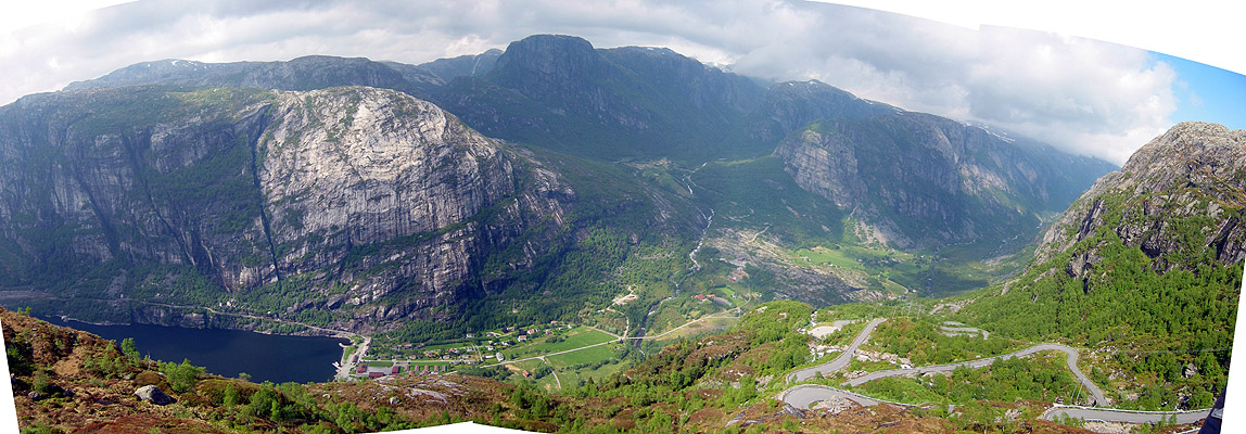 Panoramic view of Lysebotn from Oygardsstolen Cafe, 700 m above sea level. Notice the hairpin turns of the road on the right.