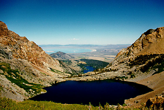| Photo by Kim Lewis. Bloody Canyon from our campsite. Starting upstream: Lower Sardine Lake, Walker Lake, Mono Lake. The foreboding blackness of Lower Sardine Lake is no photographic artifact - that sucker is deep! |