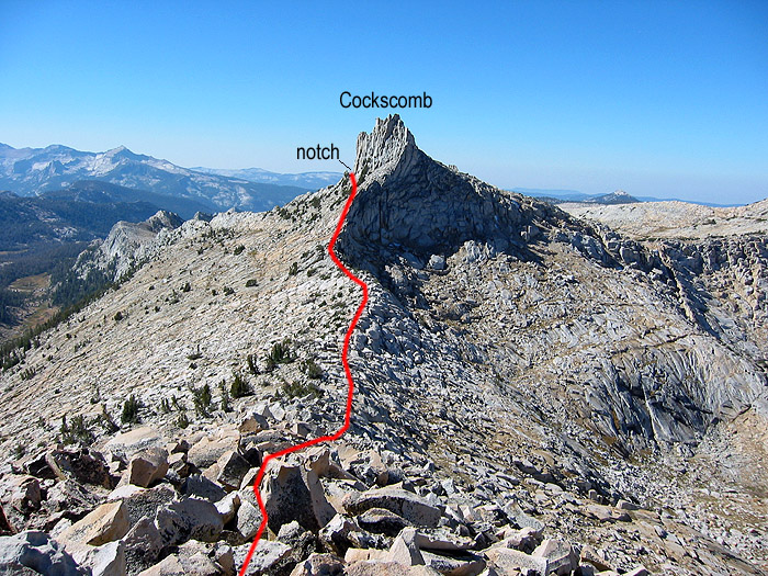 Cockscomb from the north, taken from the summit of "Mount Althuski" If climbing Cockscomb from the north, traverse the east side of Cockscomb's summit block, to an obvious notch, then go around and climb the west face.
