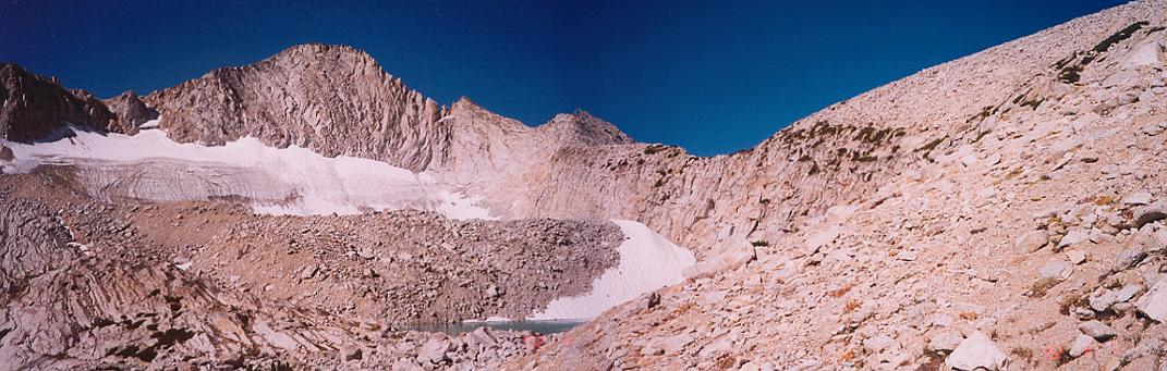 Panoramic image of Mount Conness, Conness Glacier, and the uppermost of the Conness Lakes. We traversed in an arc from right to left. Conness's North Ridge, with its two "towers" are nicely visible here.