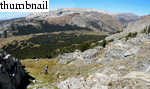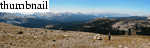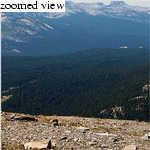 We followed game trails through a verdant forest for a while, but I knew we must be off-route for one simple reason: the official trail climbs 3500 feet in about three miles, and we had barely climbed at all over about a mile. So I repeated to Kim the nearly-unassailable adage: "When in doubt, go uphill." Up, up and away, we moved southeast up a 30° slope, aided in spots by lovely grass. Strenuous, considering that we'd just driven up from sea level. Luckily we generally are not afflicted by altitude sickness. Views are fantastic; better than the standard route's, from what I've heard. Panoramic views from Kuna Crest to Tuolumne Meadows to the omnipresent Mount Conness.