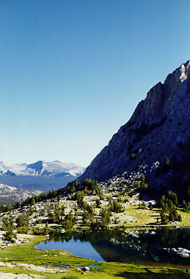 Photo by Kim Lewis. Dramatic view of Vogelsang Lake, Fletcher Peak, and more distant peaks around Mount Conness to the north.