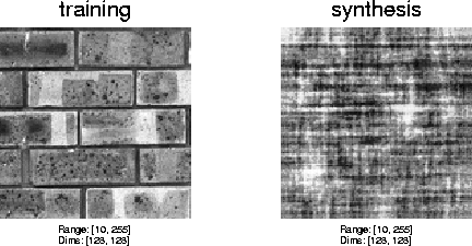 Figure 3 This method does a marvelous job of synthesizing the sepele bark image. Though it obviously has features with different characteristic size, the image is roughly stationary upon inspection, and its spatial features are not sharply localized in space, and is thus quite easy to synthesize. | ![]() |