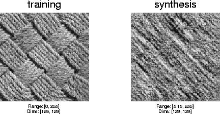 Figure 5 This image is simply parameterized in terms of two-point statistics, which our algorithm uses, hence the excellent synthesis of the herringbone fabric image. This result effectively maintains the vertical homogeneity property of the TI. | ![]() |
